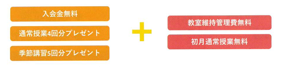 兄弟・姉妹とご一緒にお通いのご家庭を優待させていただく制度です。教室維持管理費を無料にし、さに気軽に通塾をスタートできるように初月の通常授業(週2回分まで)を無料にいたします。