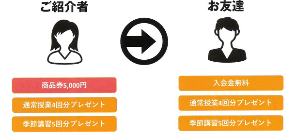 学校や習い事のお友達、部活動の先輩、後輩などをご紹介していただいた場合に、ご紹介した生徒さんとご紹介された生徒さんお二人を優待する制度です。